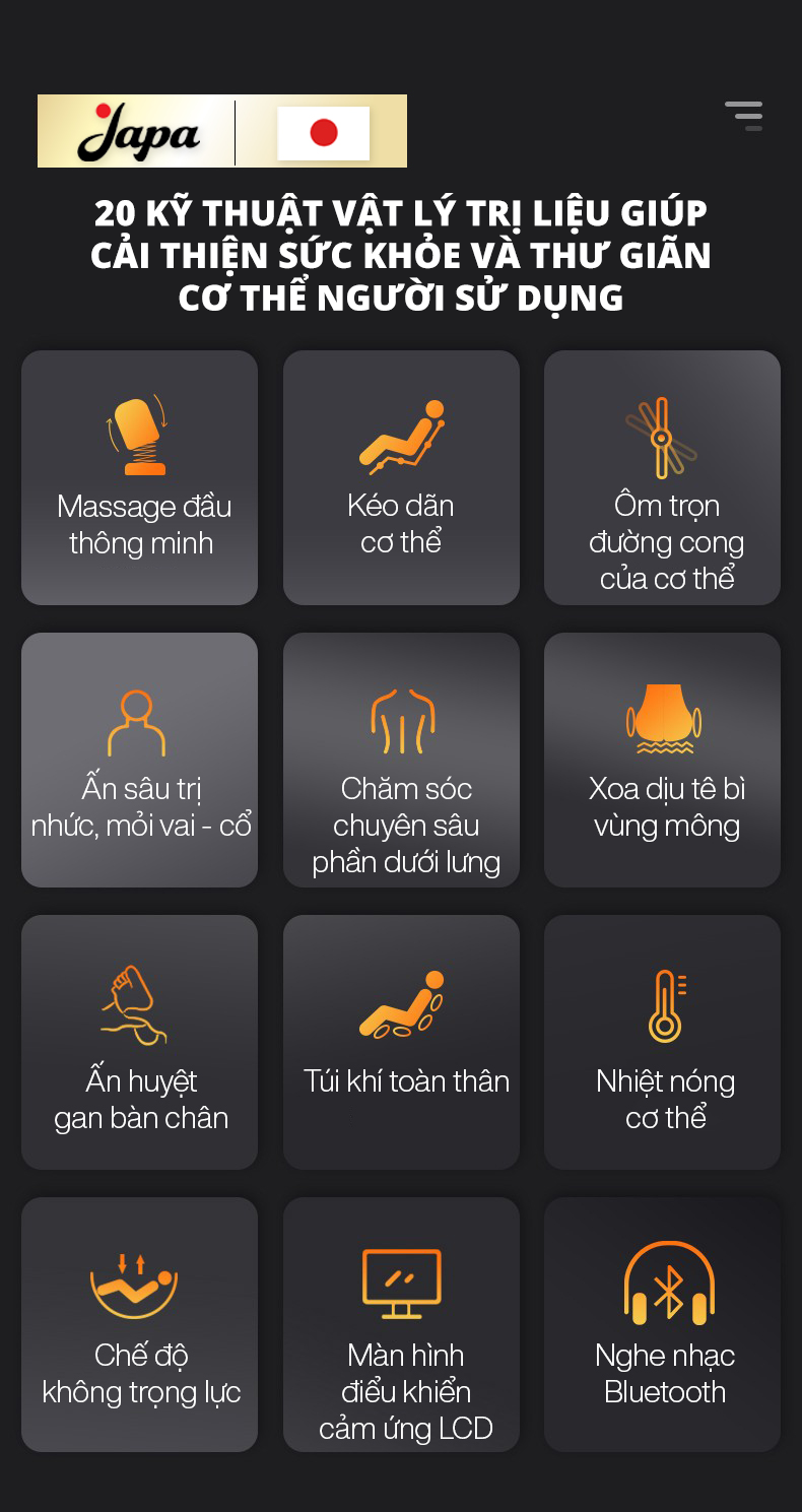 20 kỹ thuật massage được trang bị trên ghế Massage Japa JP-589 sử dụng để giúp cải thiện sức khỏe và thư giãn cơ thể người sử dụng: