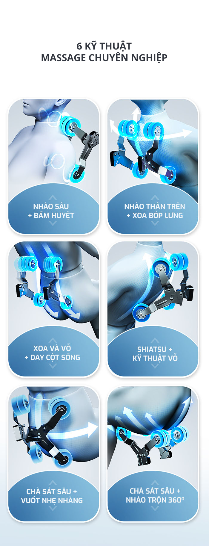 Mỗi kỹ thuật được thiết kế để tác động chính xác vào các vùng cơ thể cần điều trị, mang lại cảm giác thư giãn tuyệt vời và hiệu quả cao.