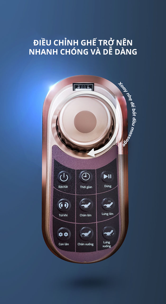 Ghế Massage Japa JP-888 không chỉ nổi bật về công nghệ massage tiên tiến mà còn về tính tiện dụng. Với núm điều khiển tích hợp, người dùng có thể dễ dàng thao tác với một nút bấm duy nhất để chọn chương trình massage ưa thích. Việc điều chỉnh ghế trở nên nhanh chóng và dễ dàng, giúp bạn tận hưởng liệu pháp massage hiệu quả mà không mất thời gian.