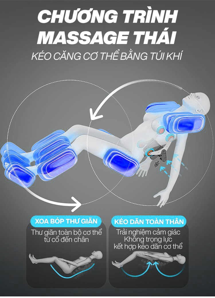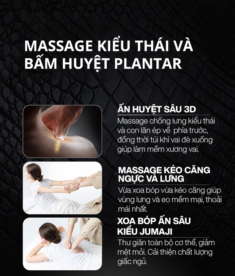Ghế Massage Japa Phantom Plus còn tích hợp chế độ massage kiểu Thái, giúp tác động sâu vào cơ thể, đặc biệt là các cơ bắp căng cứng. Điều này sẽ giúp giảm đau nhức và mang lại cảm giác thoải mái tuyệt vời. Ngoài ra, tính năng bấm huyệt Plantar là điểm nổi bật, giúp kích thích các huyệt đạo ở lòng bàn chân, hỗ trợ điều trị các vấn đề về sức khỏe như đau nhức, mỏi cơ, và cải thiện tuần hoàn máu.