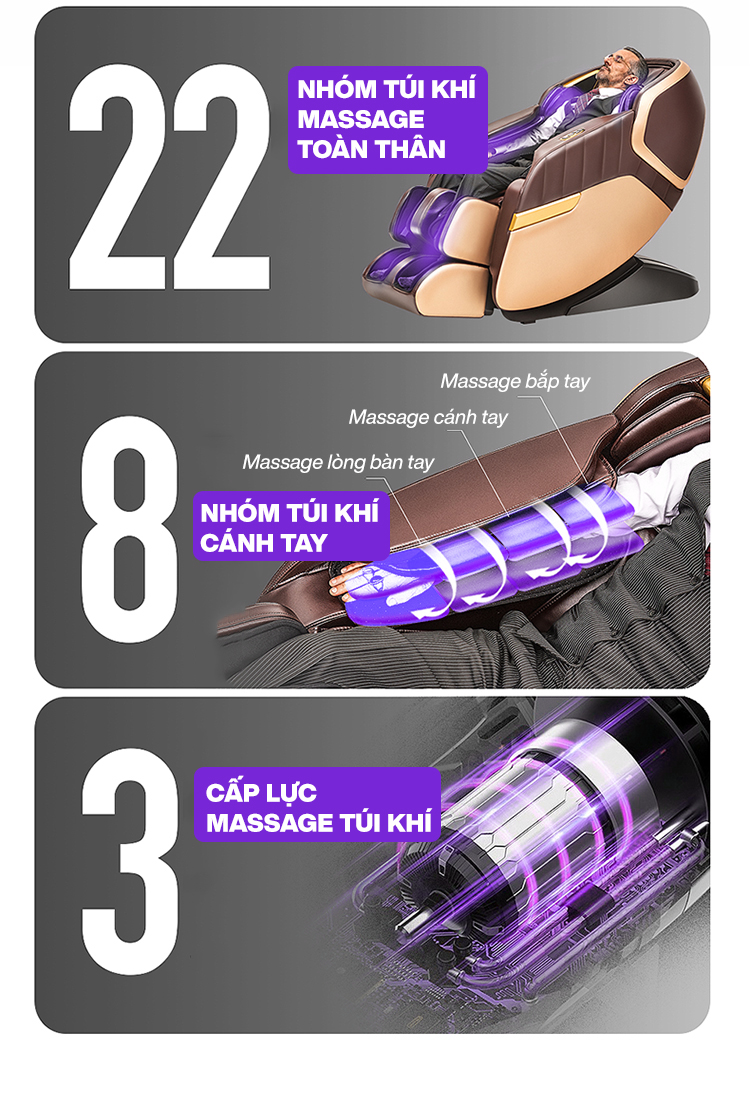 Một trong những điểm mạnh của Ghế Massage Japa Phantom Plus chính là hệ thống 22 túi khí toàn thân. Những túi khí này được bố trí một cách hợp lý, giúp massage và thư giãn các vùng cơ thể khác nhau như vai, lưng, hông, chân, bắp tay và lòng bàn chân. Sự kết hợp giữa massage túi khí và các con lăn sẽ giúp cơ thể được thư giãn sâu, giảm đau nhức và căng thẳng hiệu quả.